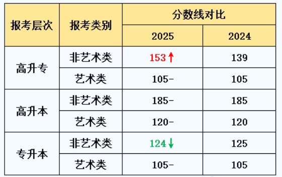 本年度成考省控线较2024年基本持平。其中,高升专非艺术类上涨14分,专升本非艺术类下降1分,总体而言,成考划线呈现平稳趋势。