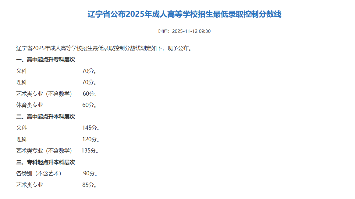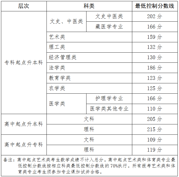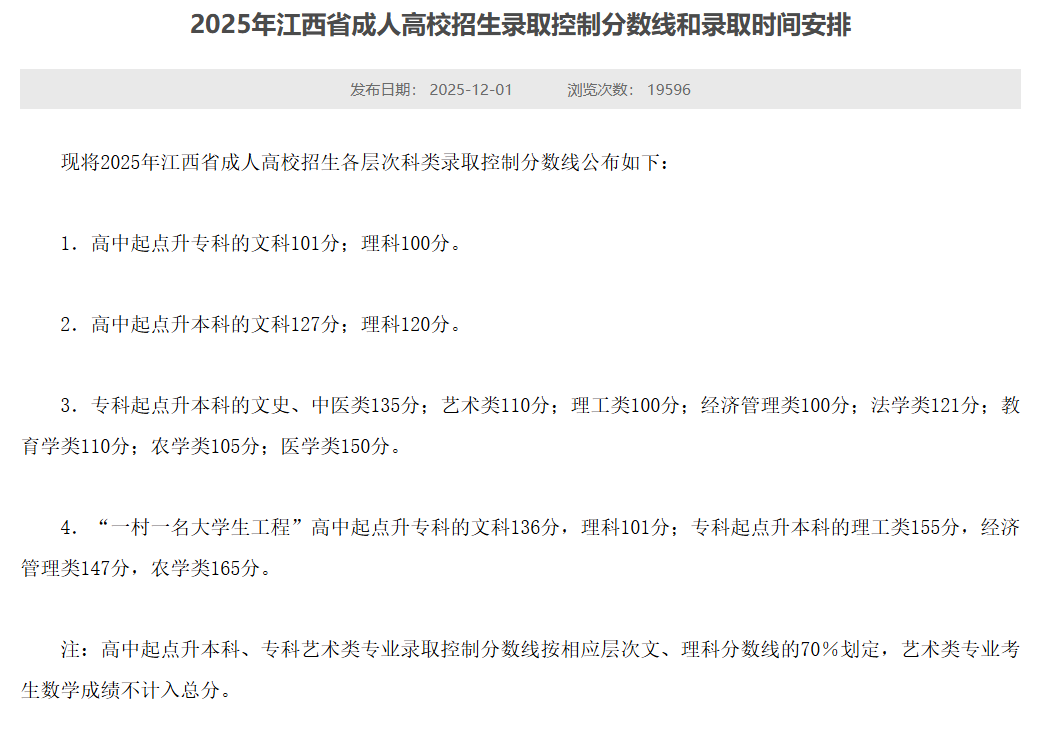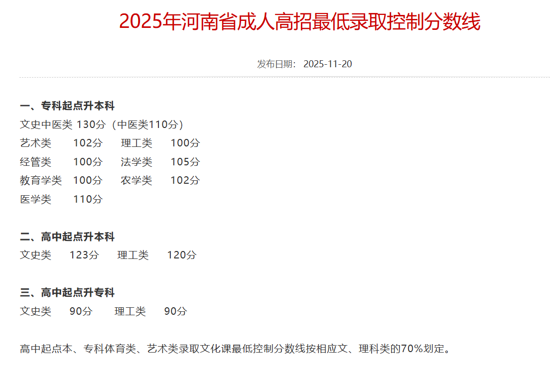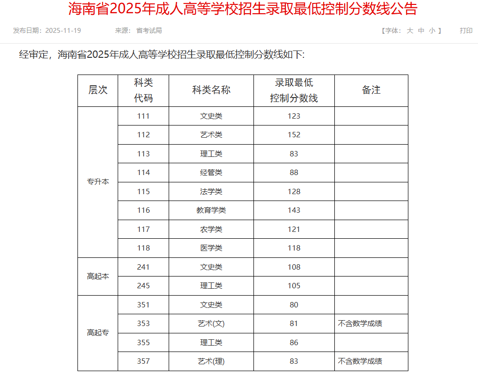 2025年我省成人高校招生考试评卷工作已经结束,根据教育部有关文件精神和我省今年招生计划、报名人数、考试成绩等情况,划定我省2025年成人高校招生录取最低控制分数线,现公布如下: