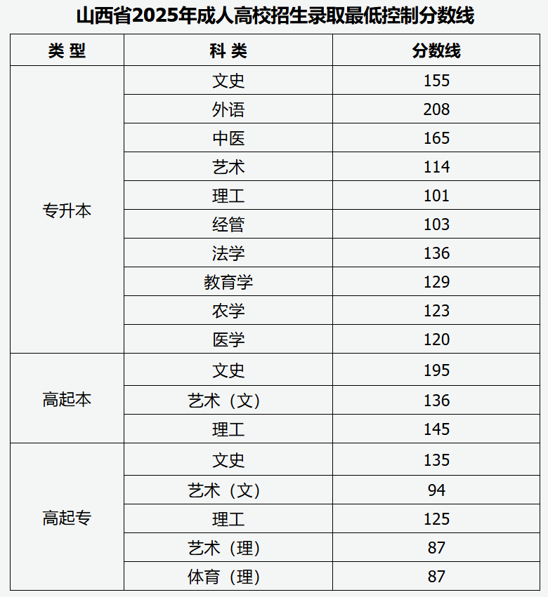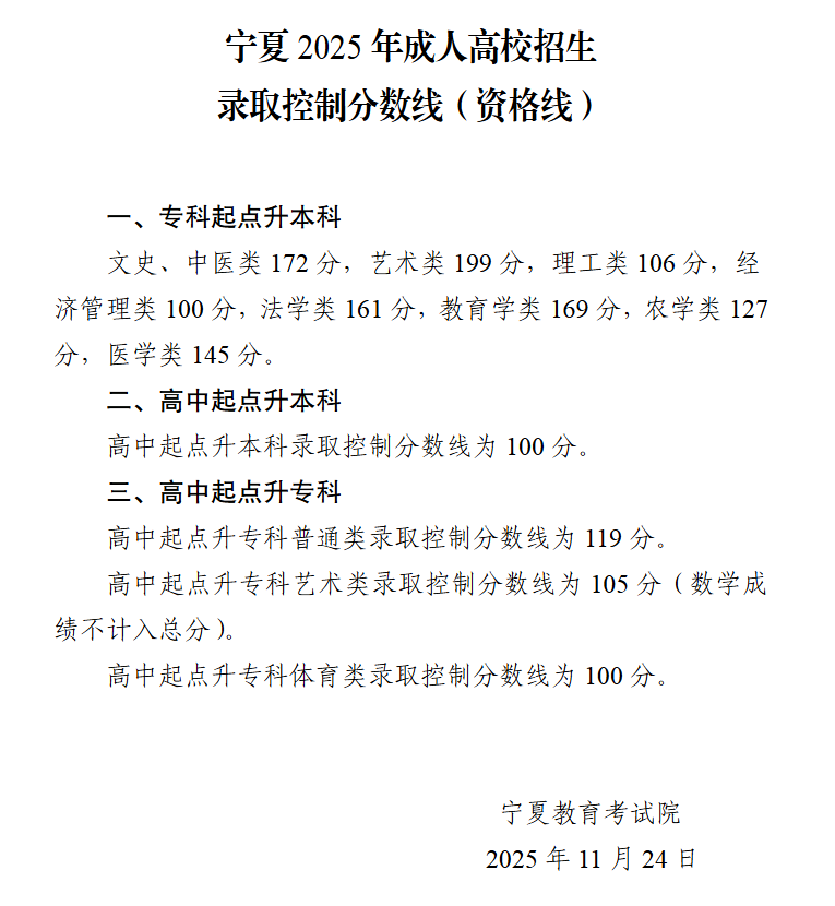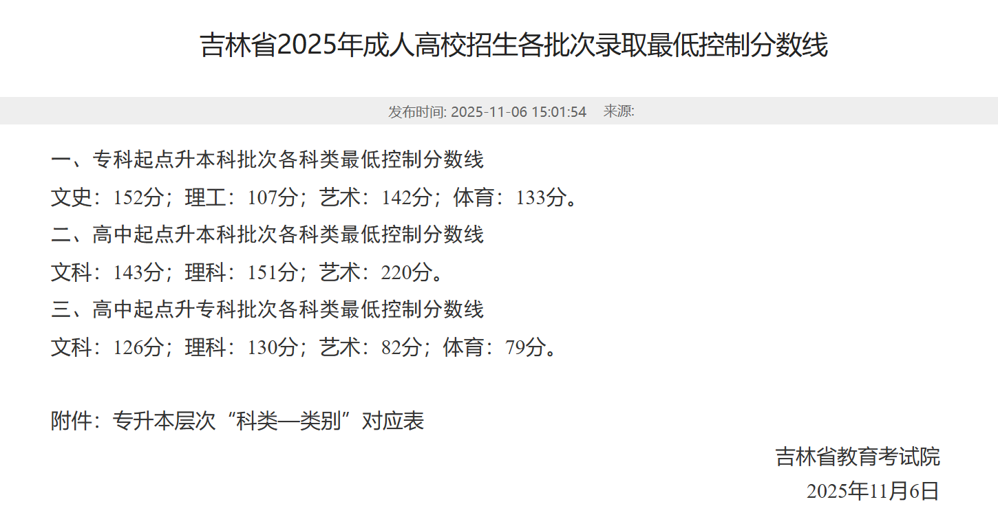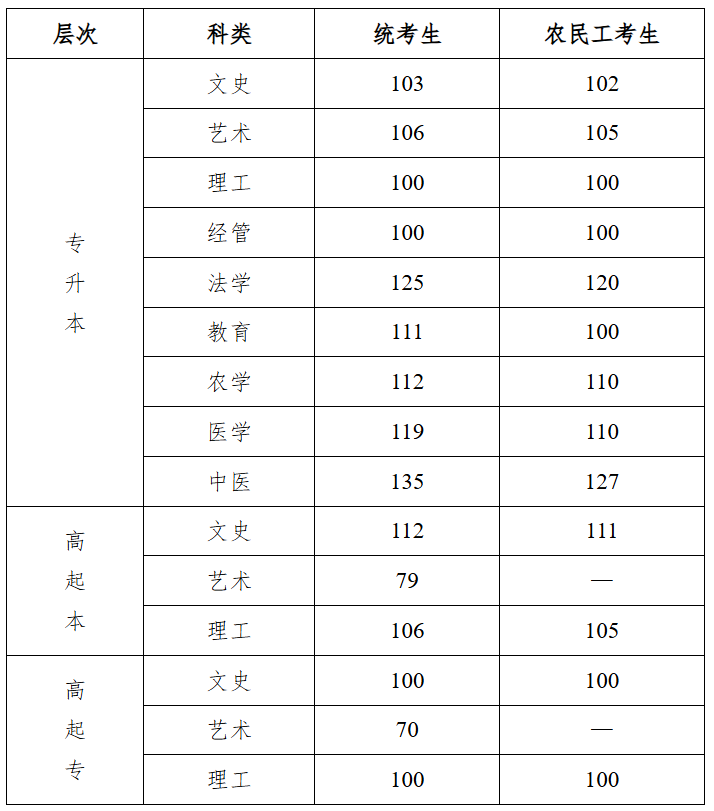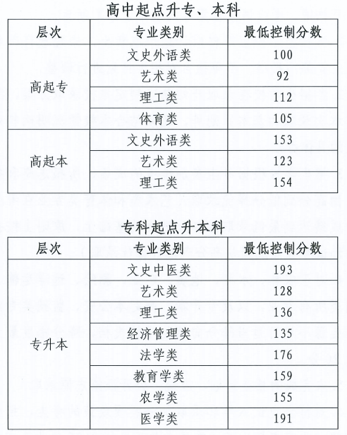 2025年我省成人高校招生考试评卷工作已经结束,根据教育部有关文件精神和我省今年招生计划、报名人数、考试成绩等情况,划定我省2025年成人高校招生录取最低控制分数线,现公布如下: